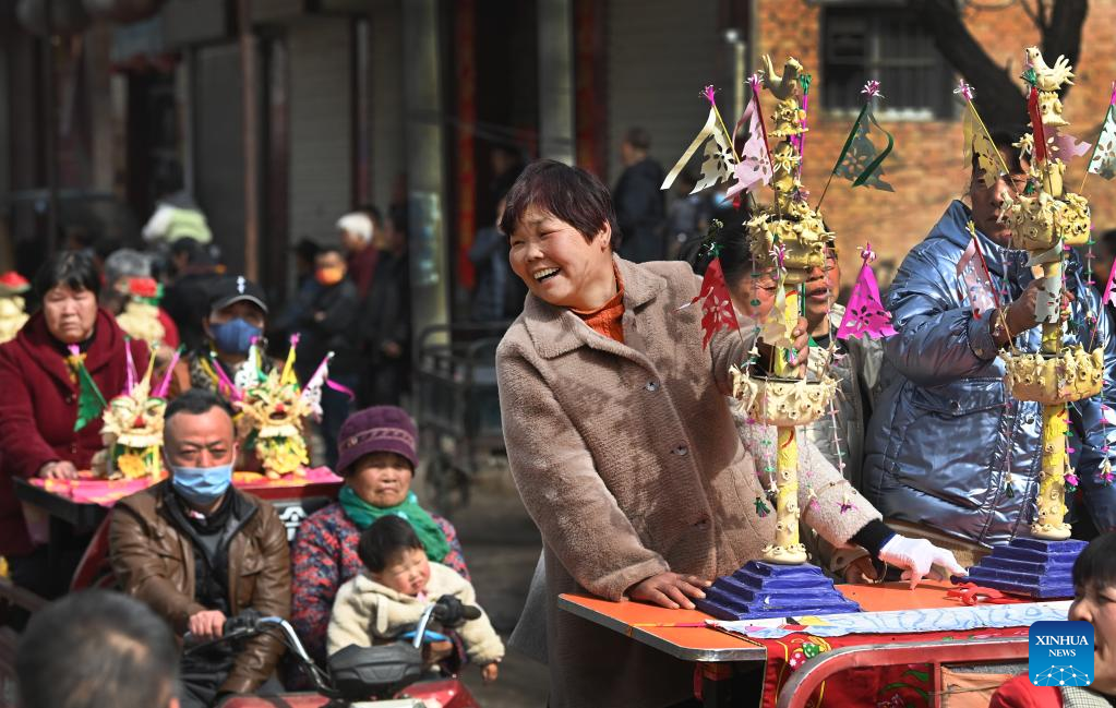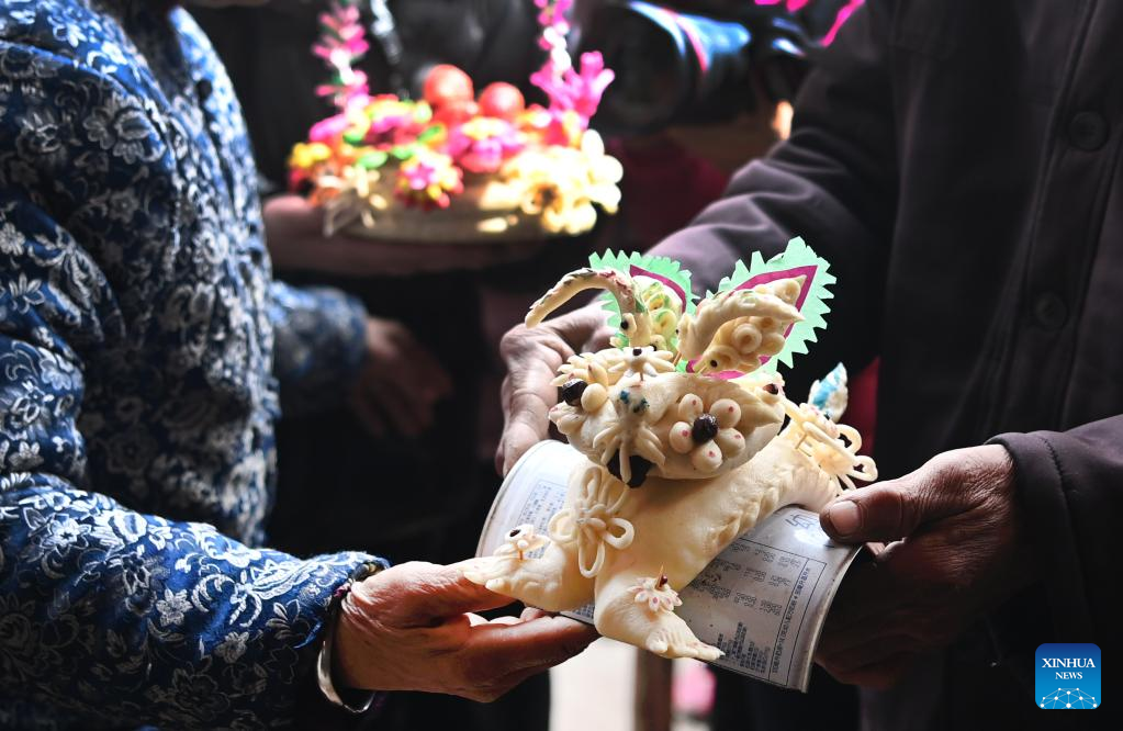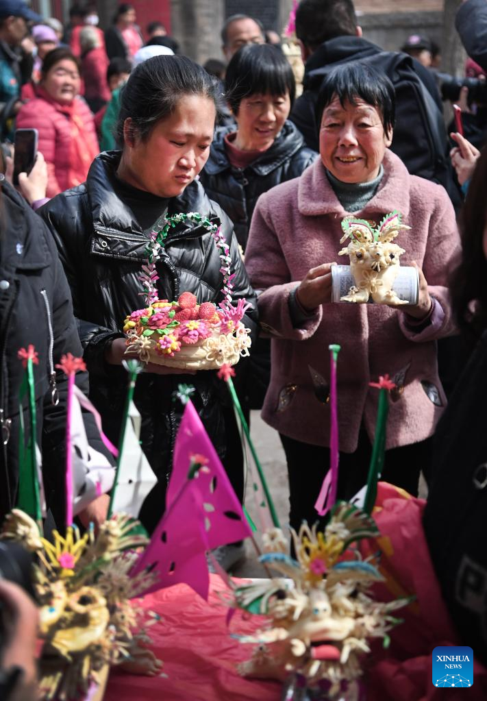 Villagers participate in a dough-modeling competition as part of the Shehuo performance in Ashou Village, Qiangbai Township, Dali County, Weinan City, northwest China's Shaanxi Province, March 3, 2022. The Shehuo parade, a time-honored performance enjoying widespread popularity in rural areas across China, originated from ancient sacrificial activities to pray for a good harvest about 2,000 years ago.