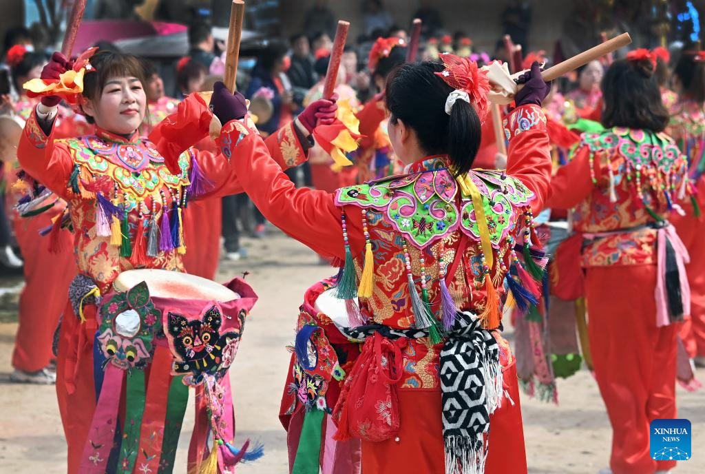 Villagers take part in a Shehuo performance in Ashou Village, Qiangbai Township, Dali County, Weinan City, northwest China's Shaanxi Province, March 2, 2022. The Shehuo parade, a time-honored performance enjoying widespread popularity in rural areas across China, originated from ancient sacrificial activities to pray for a good harvest about 2,000 years ago.
