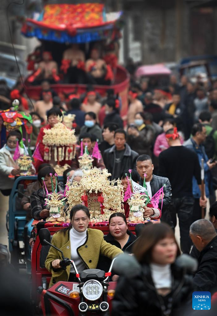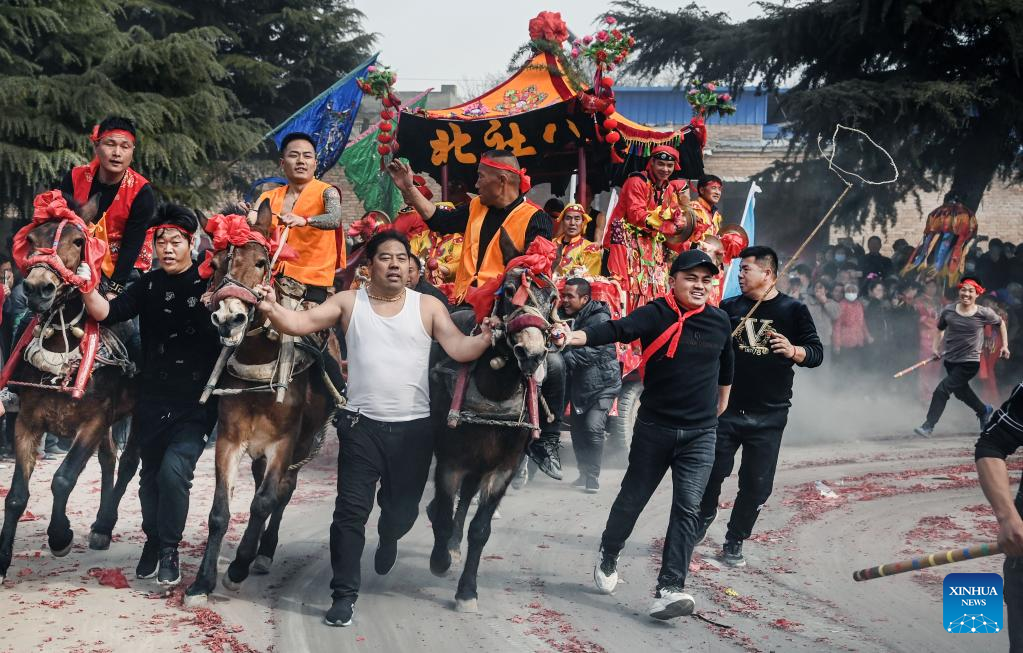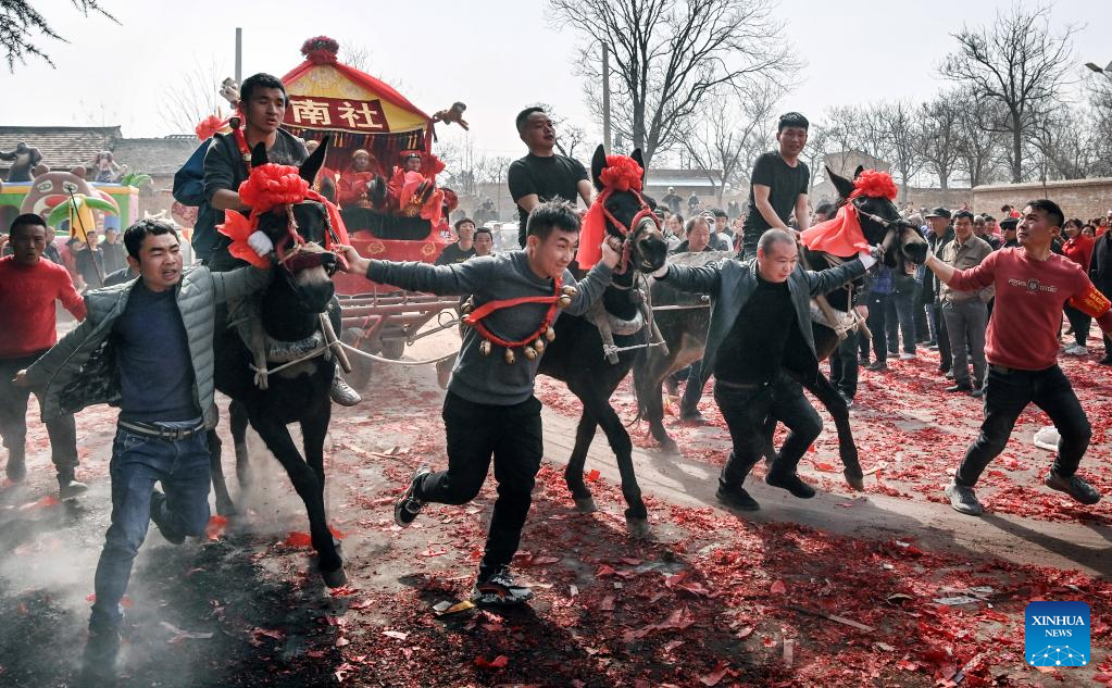 Villagers take part in a Shehuo performance in Ashou Village, Qiangbai Township, Dali County, Weinan City, northwest China's Shaanxi Province, March 3, 2022. The Shehuo parade, a time-honored performance enjoying widespread popularity in rural areas across China, originated from ancient sacrificial activities to pray for a good harvest about 2,000 years ago.