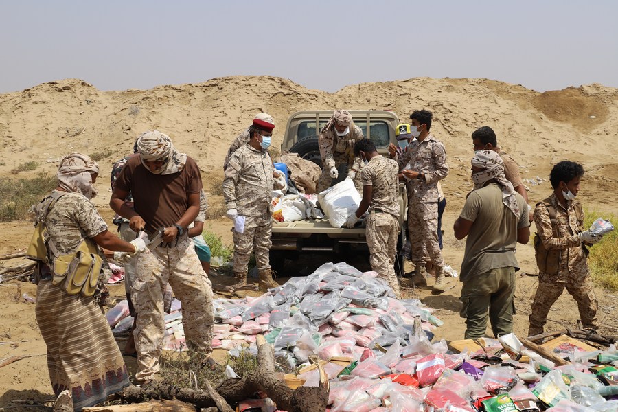 Yemenis soldiers prepare seized hashish and other drugs for destruction in Hajjah Province, northern Yemen, on March 3, 2022. (Photo by Mohammed Al-Wafi/Xinhua)