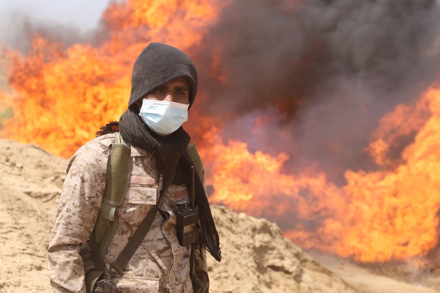 A Yemeni soldier stands before the fire used to destroy seized hashish and other drugs in Hajjah Province, northern Yemen, on March 3, 2022. (Photo by Mohammed Al-Wafi/Xinhua)
