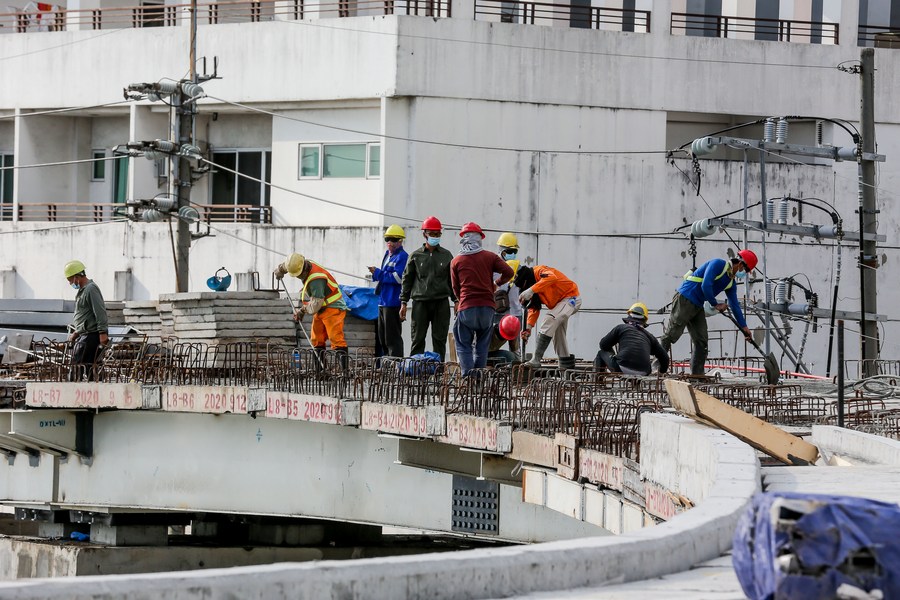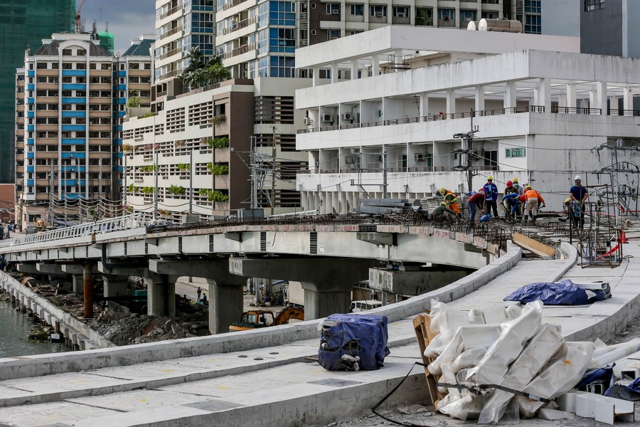 Workers are seen on the construction site of the China-funded Binondo-Intramuros Bridge in Manila, the Philippines on March 3, 2022. (Xinhua/Rouelle Umali)