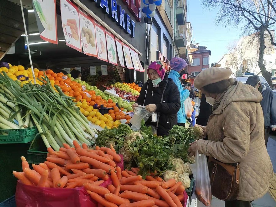 People buy fruits and vegetables at a shop in Istanbul, Turkey, Feb. 11, 2022. (Xinhua/Shadati)