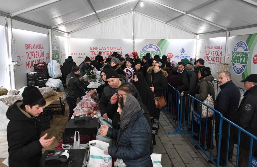 Local residents buy food at a direct-sale point on Taksim Square in Istanbul, Turkey, Feb. 27, 2019. (Xinhua/Xu Suhui)
