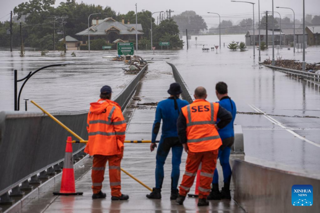 State Emergency Service members are seen near a flooded area in Richmond of New South Wales, Australia, March 4, 2022. Severe weather system, which has been ravaging Queensland and the northern New South Wales since last week, is expected to continue this week. (Xinhua/Bai Xuefei)