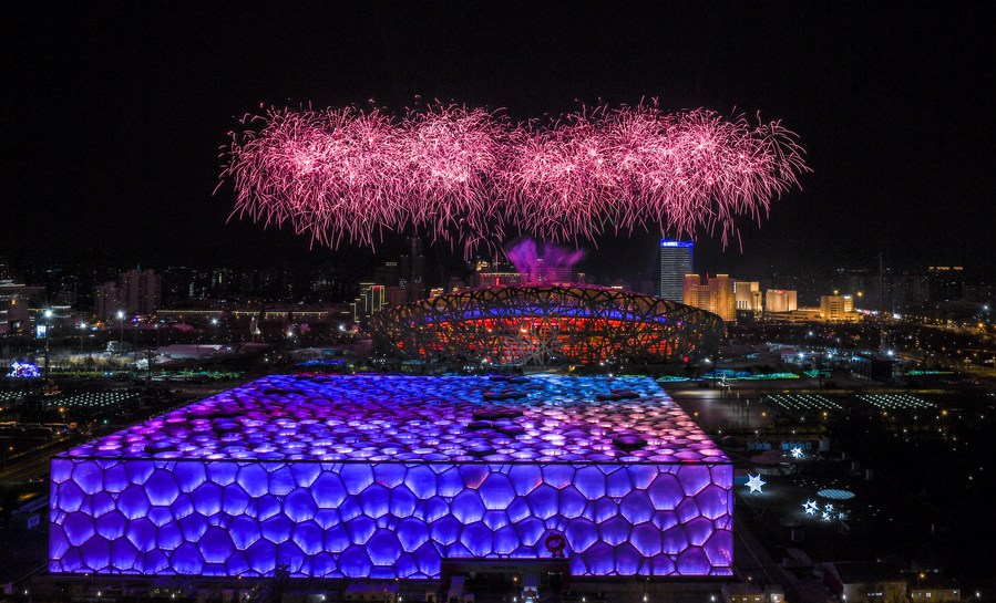 Fireworks illuminate the night sky during the opening ceremony of the Beijing 2022 Paralympic Winter Games at the National Stadium in Beijing on March 4, 2022. (Xinhua/Xia Yifang)
