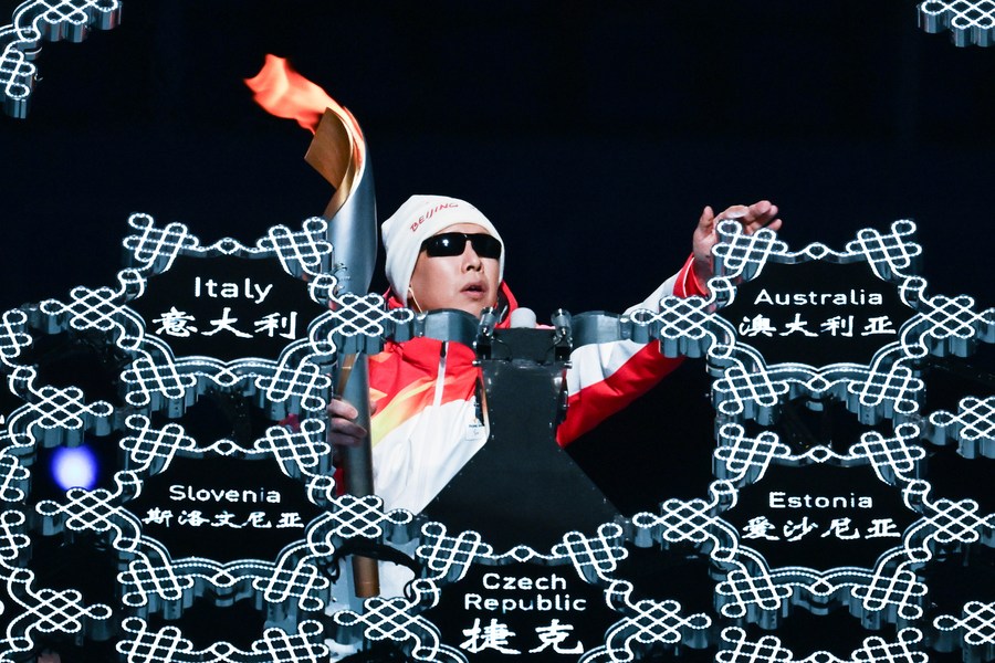 Torchbearer Li Duan places the torch in the Paralympic Winter Games cauldron during the opening ceremony of the Beijing 2022 Paralympic Winter Games at the National Stadium in Beijing on March 4, 2022. (Xinhua/Li Ga)