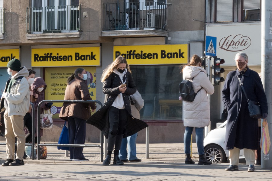 People wearing face masks wait at a tram stop in Budapest, Hungary, on Jan. 11, 2022.(Photo by Attila Volgyi/Xinhua)