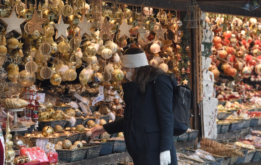 A woman shops at the Christmas market in Vienna, Austria, Nov. 15, 2021. (Xinhua/Guo Chen)