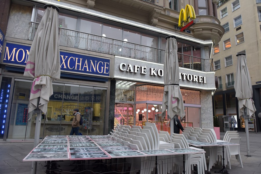 Photo taken on Nov. 22, 2021 shows a closed cafe at a shopping street in Vienna, Austria. (Xinhua/Guo Chen)