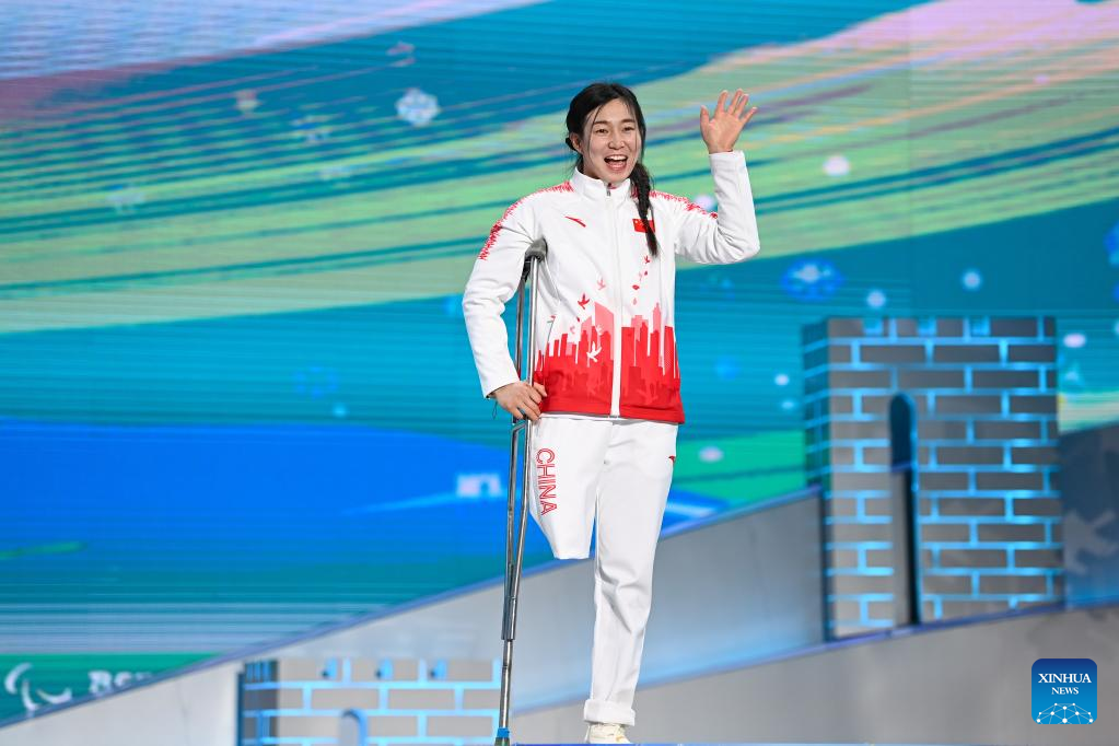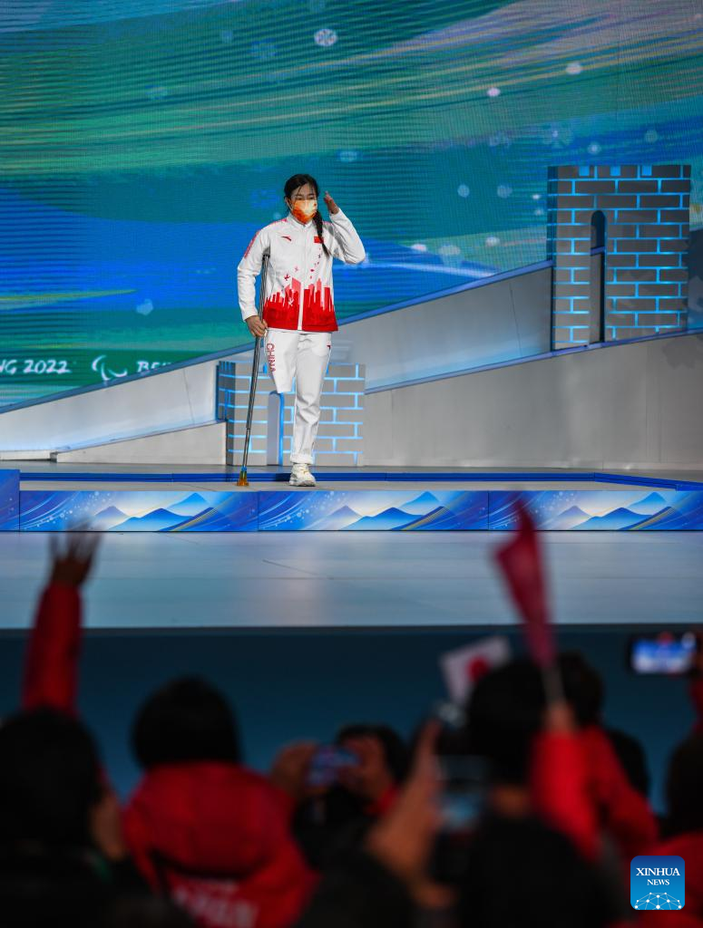 Bronze medalist Liu Sitong of China waves her hand during the awarding ceremony for the para alpine skiing Women's Downhill Sitting of Beijing 2022 Paralympic Winter Games at Yanqing Medals Plaza of the Winter Paralympics in Yanqing District, Beijing, capital of China, March. 5, 2022. (Xinhua/Jiang Han)