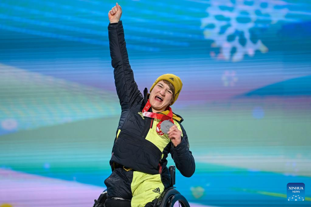 Sliver medalist Anna-Lena Forster of Germany reacts during the awarding ceremony for the para alpine skiing Women's Downhill Sitting of Beijing 2022 Paralympic Winter Games at Yanqing Medals Plaza of the Winter Paralympics in Yanqing District, Beijing, capital of China, March. 5, 2022. (Xinhua/Jiang Han)