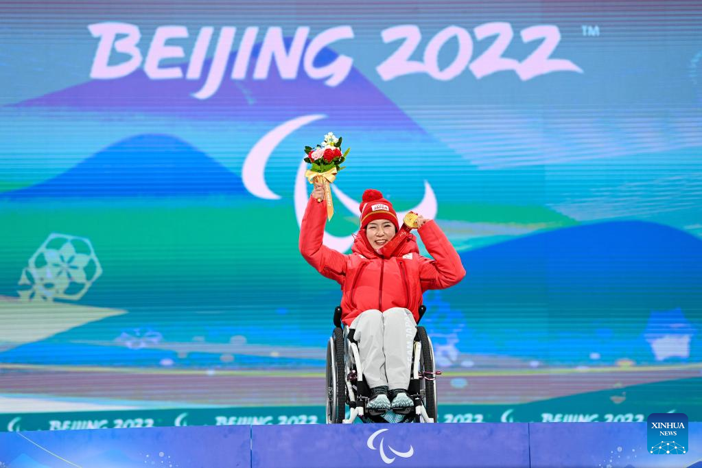 Gold medalist Muraoka Momoka of Japan poses for photo during the awarding ceremony for the para alpine skiing Women's Downhill Sitting of Beijing 2022 Paralympic Winter Games at Yanqing Medals Plaza of the Winter Paralympics in Yanqing District, Beijing, capital of China, March. 5, 2022. (Xinhua/Jiang Han)