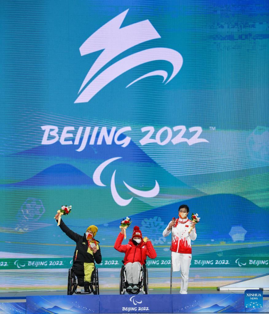 Gold medalist Muraoka Momoka of Japan(C), Sliver medalist Anna-Lena Forster of Germany(L) and Bronze medalist Liu Sitong of China pose for photo during the awarding ceremony for the para alpine skiing Women's Downhill Sitting of Beijing 2022 Paralympic Winter Games at Yanqing Medals Plaza of the Winter Paralympics in Yanqing District, Beijing, capital of China, March. 5, 2022. (Xinhua/Sun Fei)