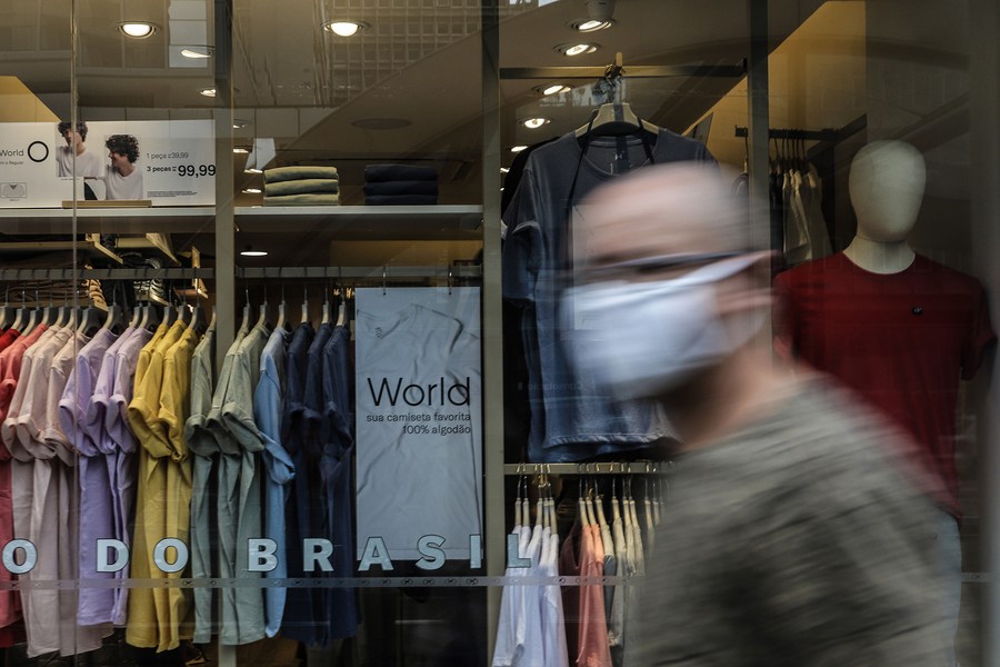 A pedestrian walks past a store in Sao Paulo, Brazil, on Sept. 1, 2020. (Xinhua/Rahel Patrasso)