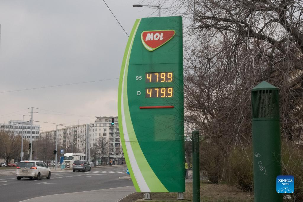Gas prices are seen at a fuel station in Budapest, Hungary, on March 4, 2022. The military conflict between Russia and Ukraine already had a negative impact on the Hungarian economy. (Photo by Attila Volgyi/Xinhua)