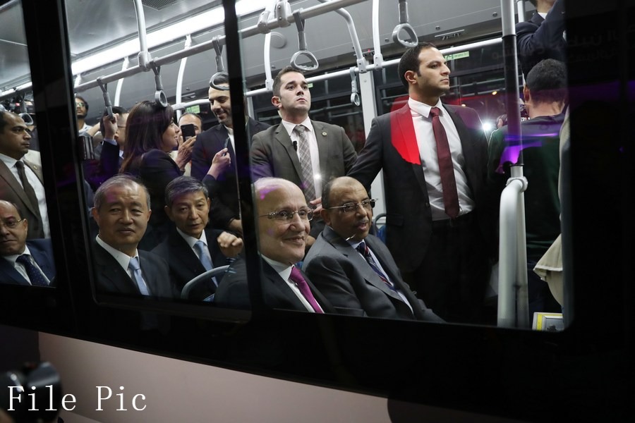 Guests have a ride in an electric bus delivered by Foton Motor in Salam City, east of Cairo, capital of Egypt, on Oct. 29, 2019. (Xinhua/Ahmed Gomaa)