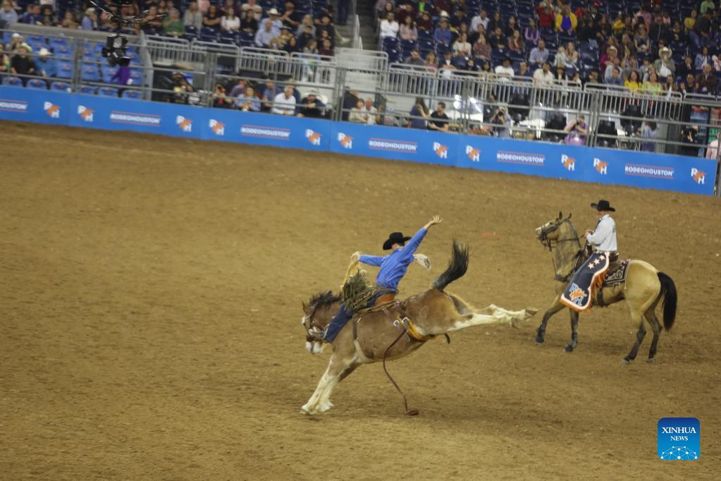 Cowboys compete at the Houston Livestock Show in Houston, Texas, the United States, March 4, 2022. The Houston Livestock Show and Rodeo, with a history of 90 years, is full of cowboy culture and customs of the American West. The festival kicks off on Feb. 28 this year and will conclude on March 20. (Xinhua/Xu Jianmei)