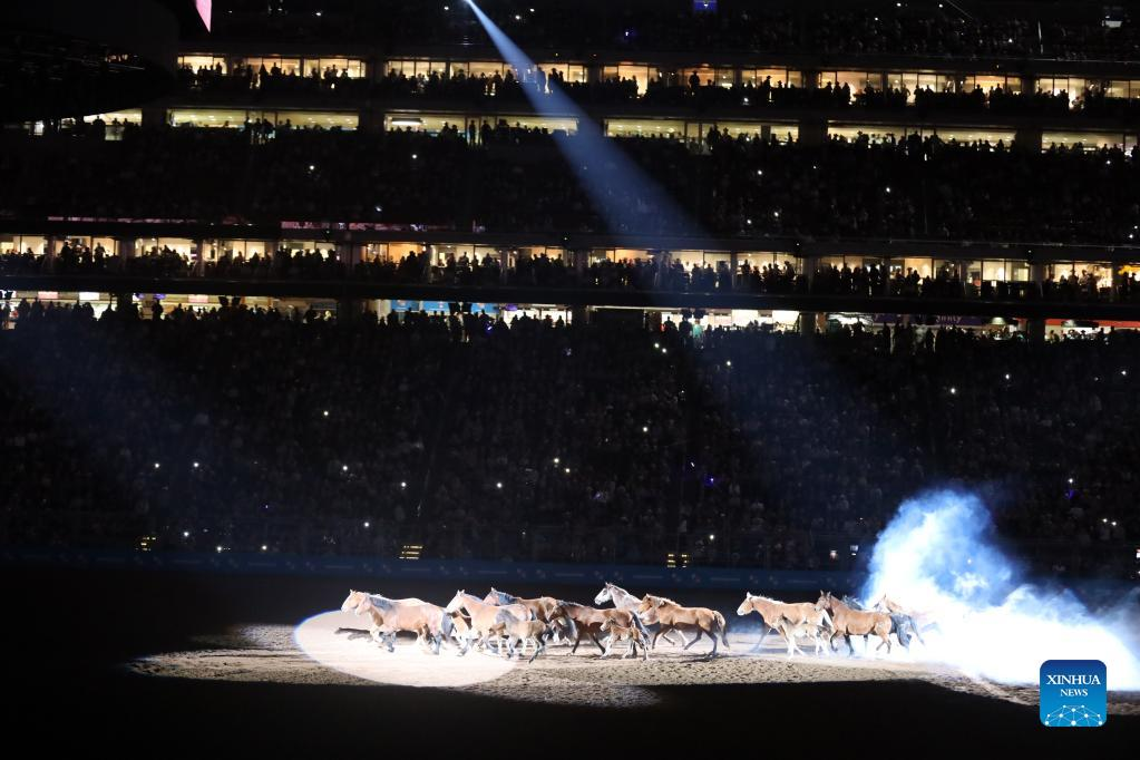Horses run at the Houston Livestock Show in Houston, Texas, the United States, March 2, 2022. The Houston Livestock Show and Rodeo, with a history of 90 years, is full of cowboy culture and customs of the American West. The festival kicks off on Feb. 28 this year and will conclude on March 20. (Xinhua/Xu Jianmei)