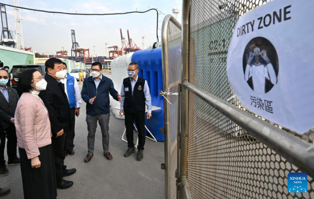 HONG KONG, March 5 (Xinhua) -- A team of mainland health experts led by Liang Wannian, head of the COVID-19 response expert panel under China's National Health Commission, on Saturday visited Hong Kong's anti-epidemic facilities in communities to learn about local testing, isolation, and treatment.