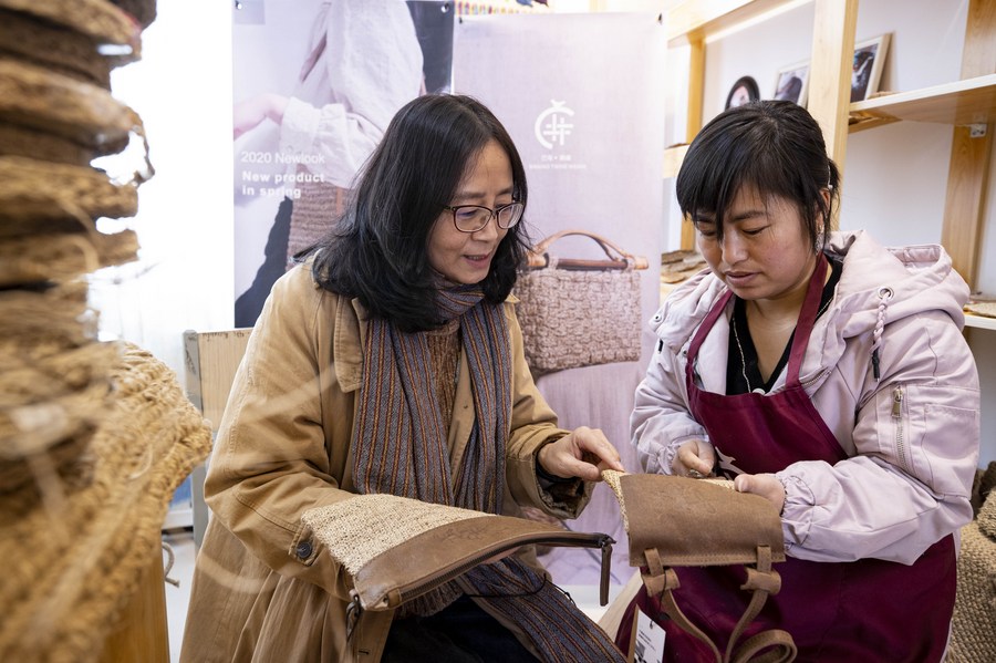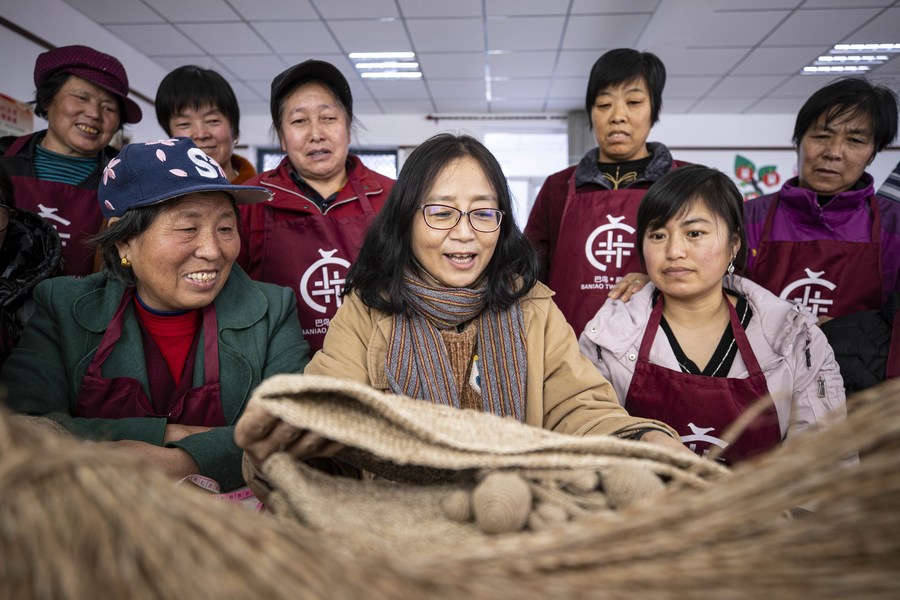 Zhang Jing (C front) checks the hemp weaving products made by the villagers in Yueyahu Township, Yinchuan, capital of northwest China's Ningxia Hui Autonomous Region, March 4, 2022. (Xinhua/Yang Zhisen)