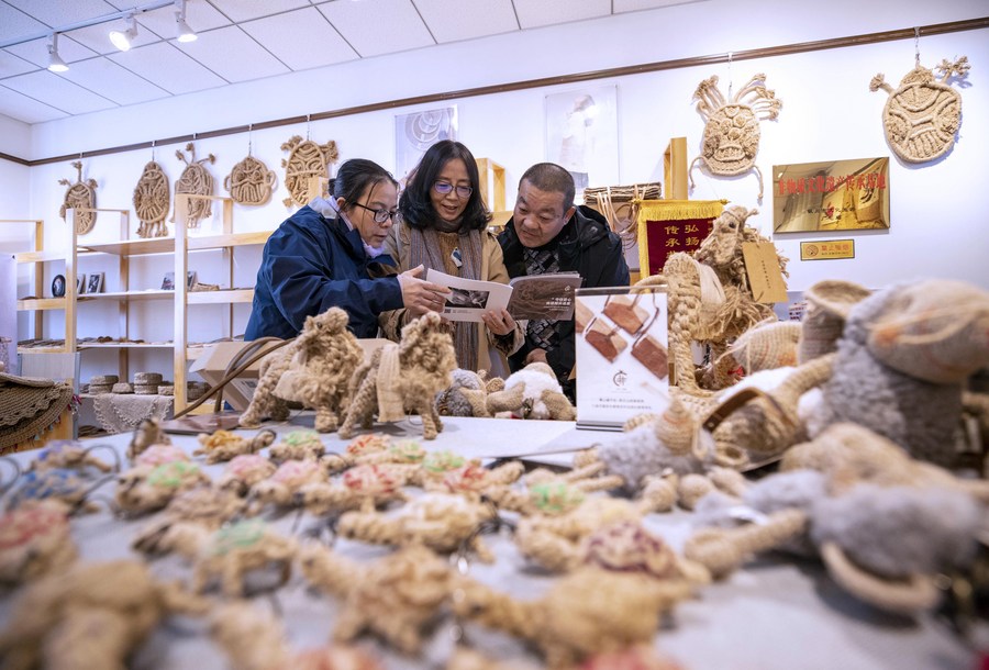 Zhang Jing (C) introduces hemp weaving to tourists in Yueyahu Township, Yinchuan, capital of northwest China's Ningxia Hui Autonomous Region, March 4, 2022. (Xinhua/Yang Zhisen)