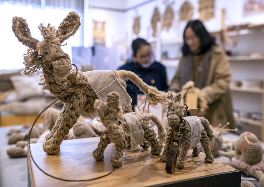 Photo taken on March 4, 2022 shows the hemp weaving products displayed at the hemp weaving workshop in Yueyahu Township, Yinchuan, capital of northwest China's Ningxia Hui Autonomous Region. (Xinhua/Yang Zhisen)