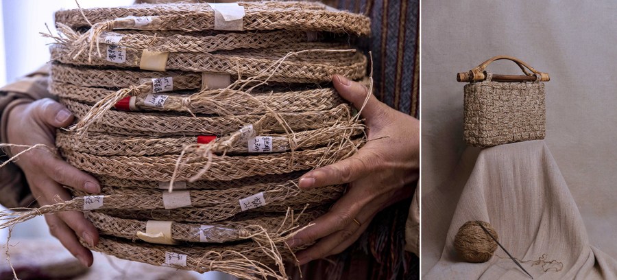 In this combo photo, the left part taken by Yang Zhisen on March 4, 2022 shows the hemp products made by villagers, in Yueyahu Township, Yinchuan, capital of northwest China's Ningxia Hui Autonomous Region; and the right part provided by the interviewee shows a bag made by Zhang Jing. (Xinhua)