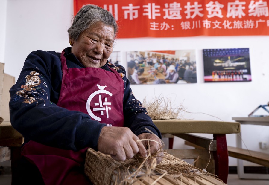 A villager weaves a hemp bag in Yueyahu Township, Yinchuan, capital of northwest China's Ningxia Hui Autonomous Region, March 4, 2022. (Xinhua/Yang Zhisen)