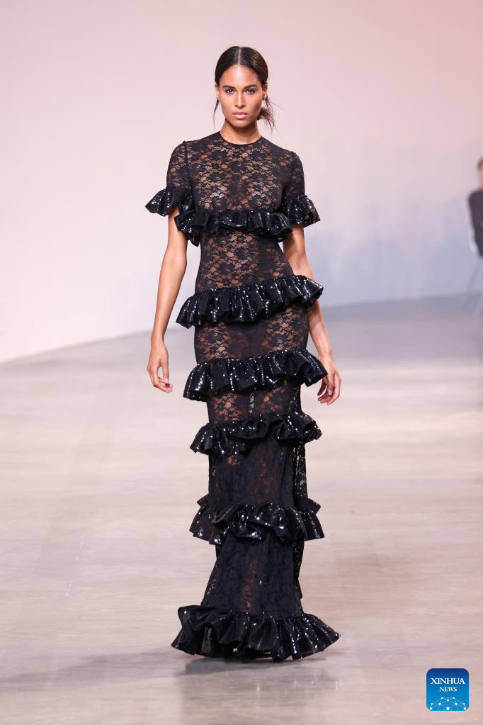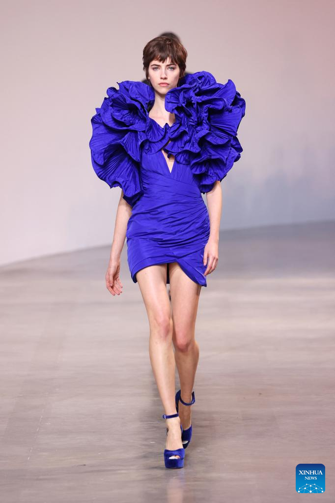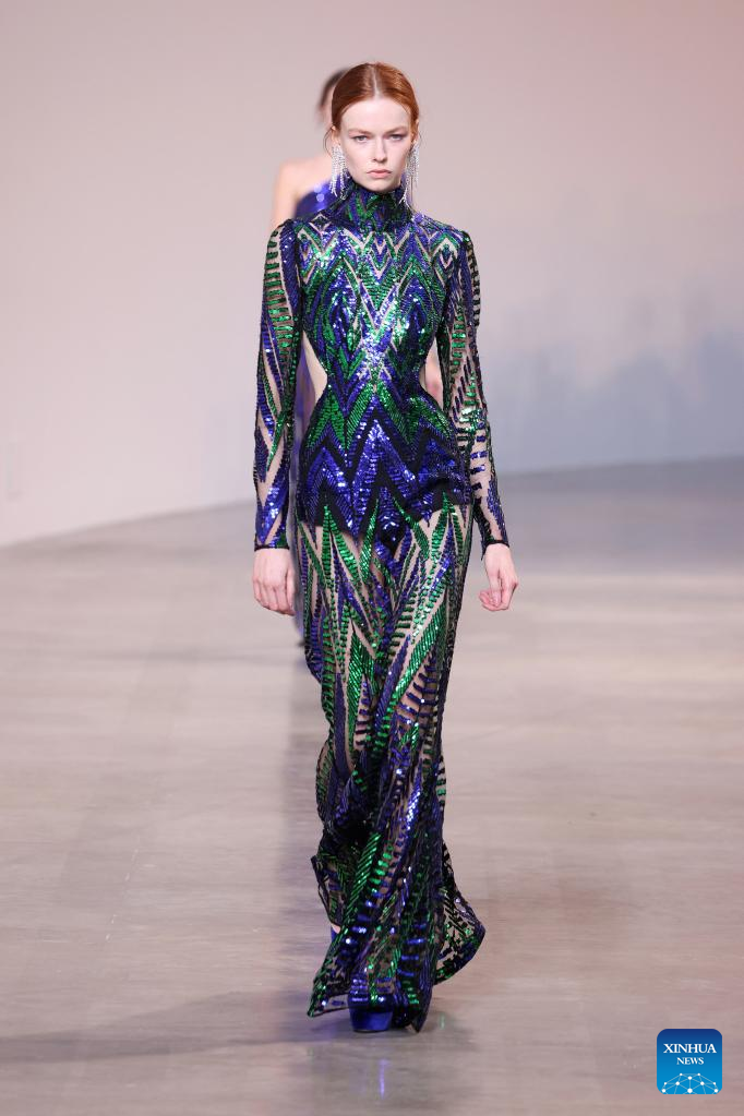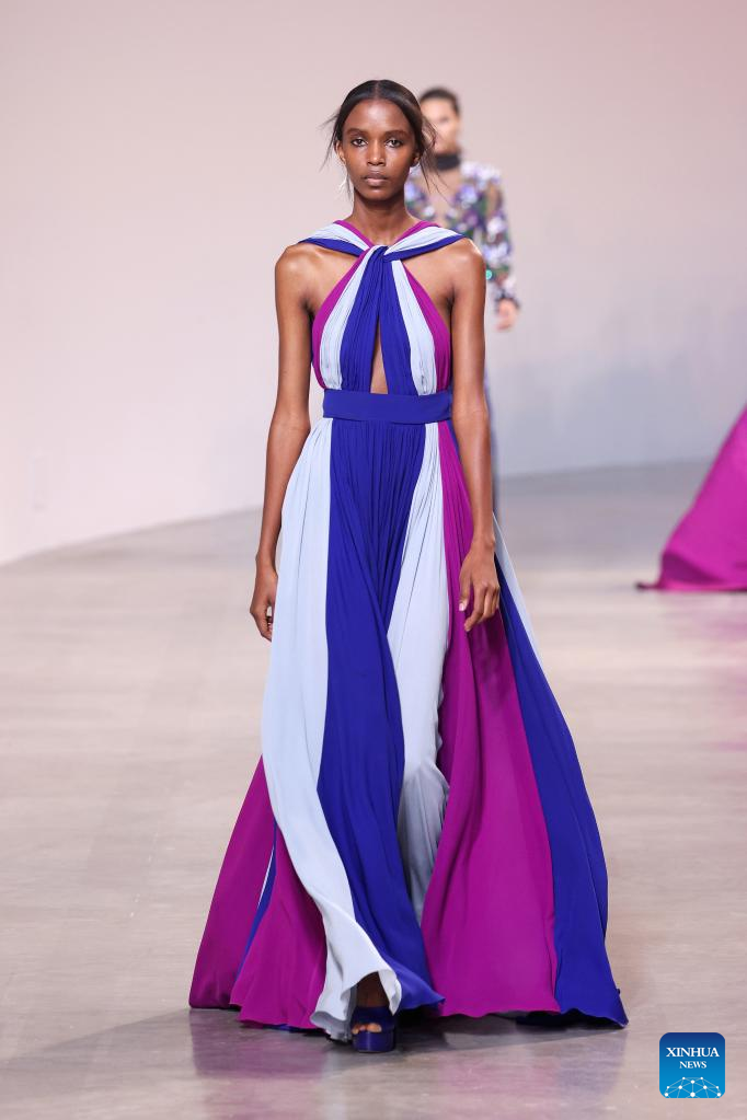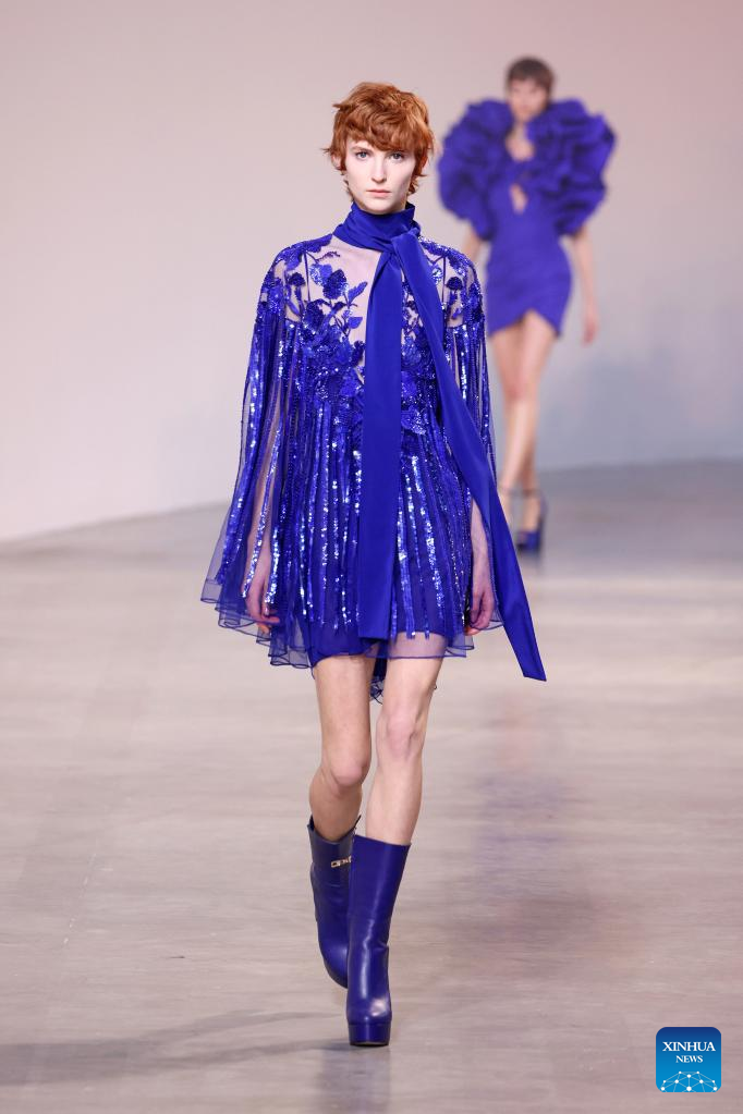 A model presents a creation of Elie Saab's Fall/Winter 2022 ready-to-wear collections during Paris Fashion Week in Paris, France, on March 5, 2022. (Photo by Piero Biasion/Xinhua)