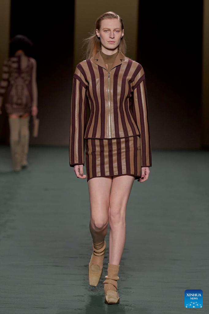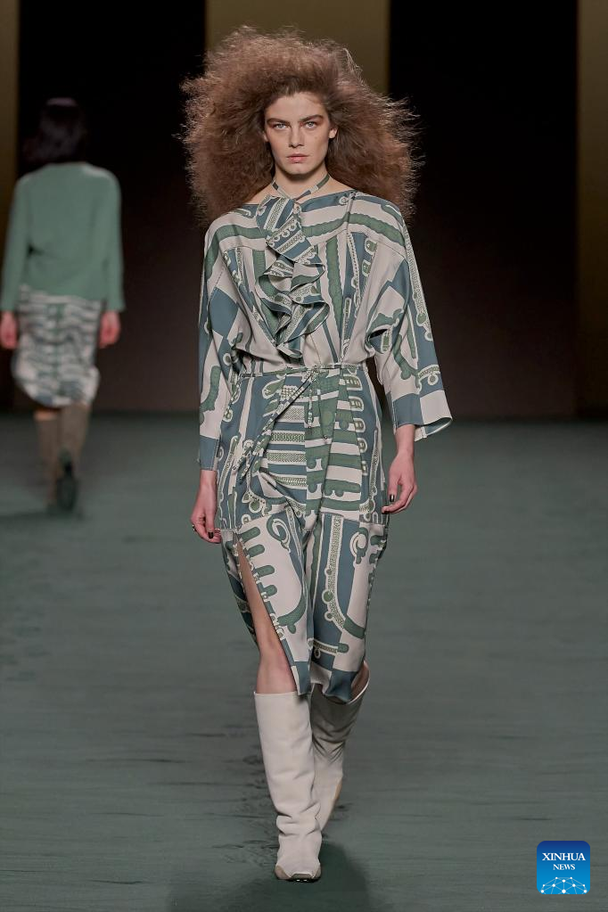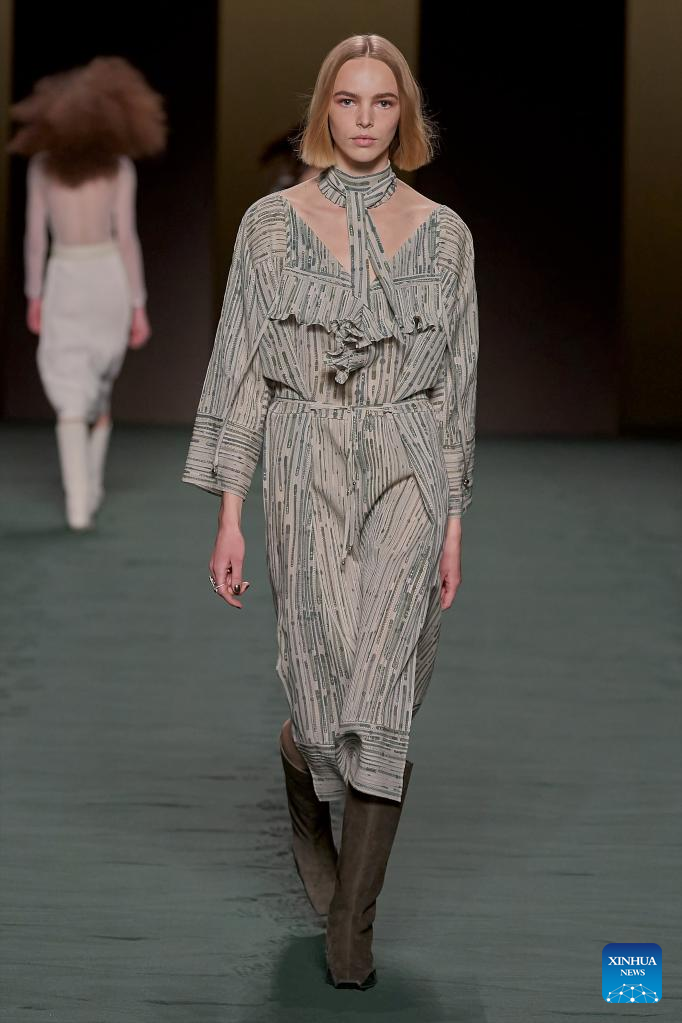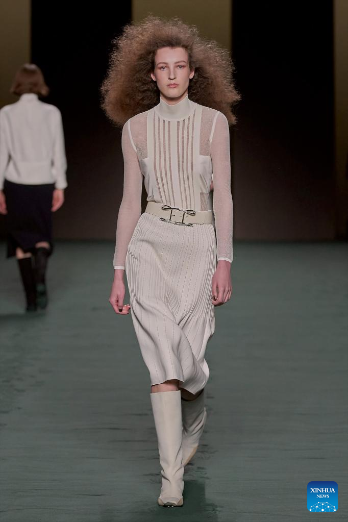 A model presents a creation of Hermes' Fall/Winter 2022 ready-to-wear collections during Paris Fashion Week in Paris, France, on March 5, 2022. (Photo by Piero Biasion/Xinhua)