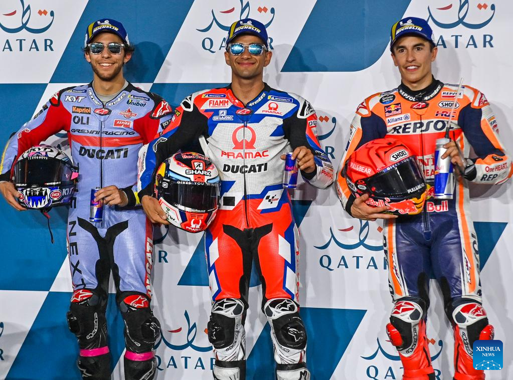 Italian MotoGP rider Enea Bastianini (L) of Gresini Racing MotoGP, Spanish MotoGP rider Jorge Martin (C) of Pramac Racing and Spanish MotoGP rider Marc Marquez (R) of Repsol Honda Team celebrate on the podium after the qualifying session of MotoGP Grand Prix of Qatar 2022 in Losail Circuit of Doha, capital of Qatar, on March 5, 2022. (Photo by Nikku/Xinhua)