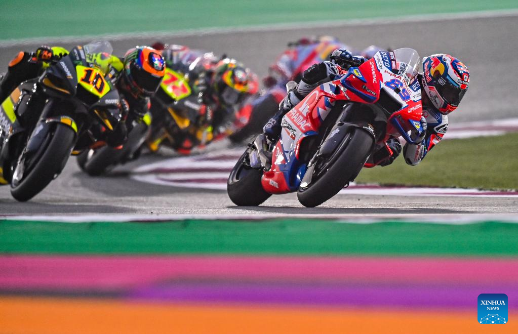 Spanish MotoGP rider Jorge Martin (R) of Pramac Racing drives during the qualifying session of MotoGP Grand Prix of Qatar 2022 in Losail Circuit of Doha, capital of Qatar, on March 5, 2022. (Photo by Nikku/Xinhua)