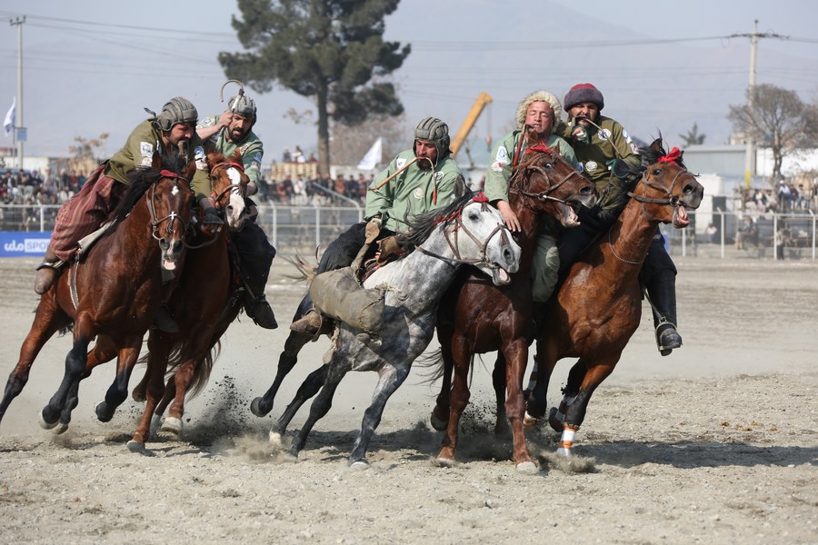 Horse riders attend a game of Buzkashi, or "goat grabbing," in Kabul, capital of Afghanistan, Feb. 27, 2022. (Photo by Saifurahman Safi/Xinhua)