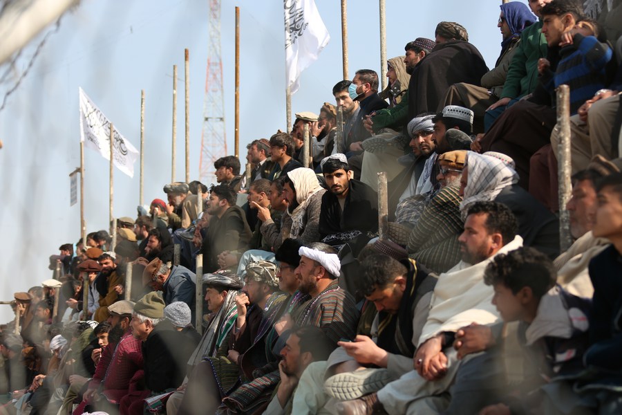People watch a game of Buzkashi, or "goat grabbing", in Kabul, capital of Afghanistan, Feb. 27, 2022. (Photo by Saifurahman Safi/Xinhua)
