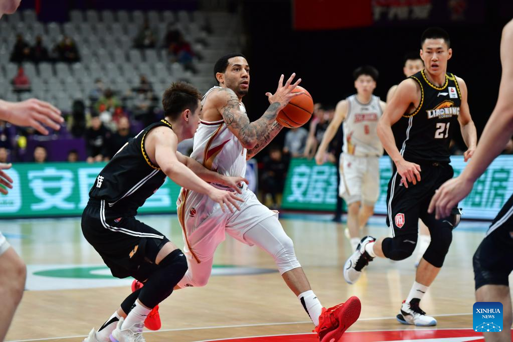 Erick Green (C) of Zhejiang Golden Bulls breaks through during the 31st round match between Liaoning Flying Leopards and Zhejiang Golden Bulls at the 2021-2022 season of the Chinese Basketball Association (CBA) league in Shenyang of northeast China's Liaoning Province, March 5, 2022. (Xinhua/Yang Qing)