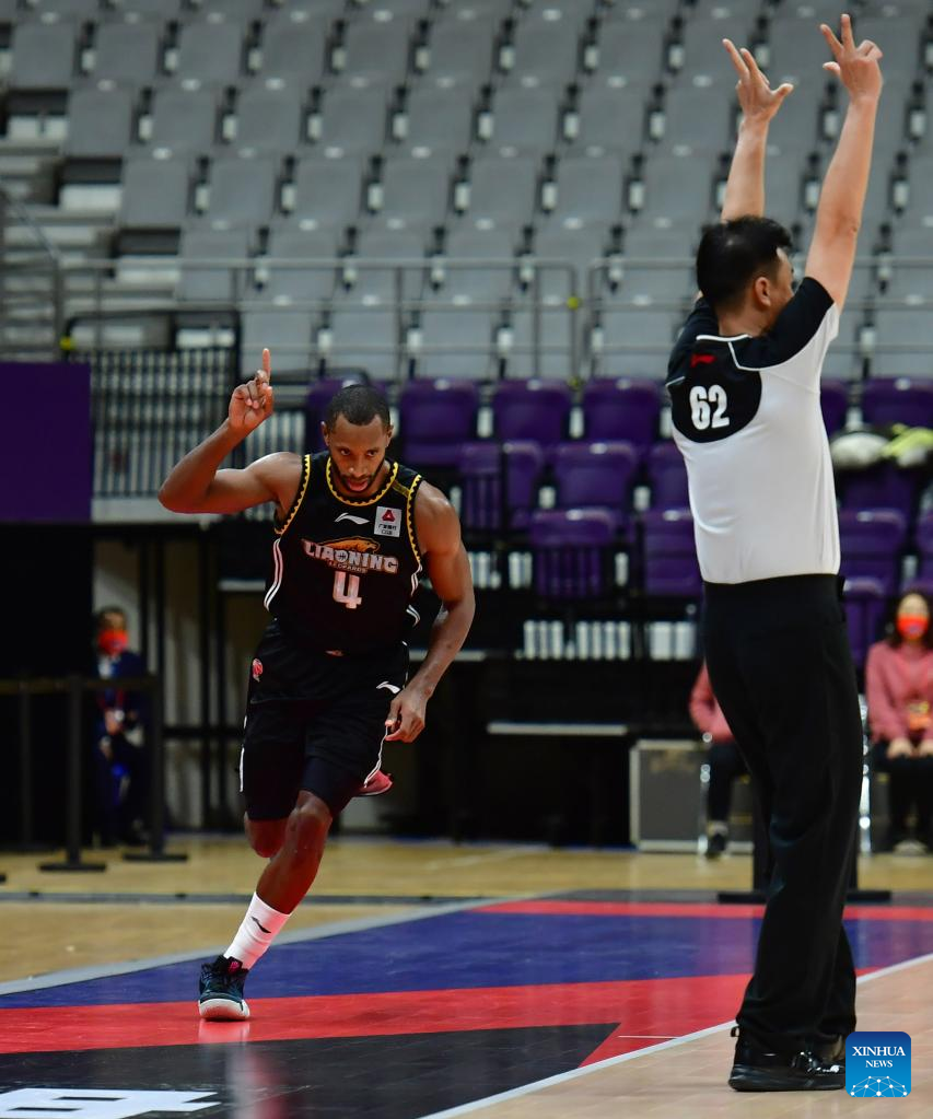 Kyle Fogg (L) of Liaoning Flying Leopards celebrates after scoring during the 31st round match between Liaoning Flying Leopards and Zhejiang Golden Bulls at the 2021-2022 season of the Chinese Basketball Association (CBA) league in Shenyang of northeast China's Liaoning Province, March 5, 2022. (Xinhua/Yang Qing)