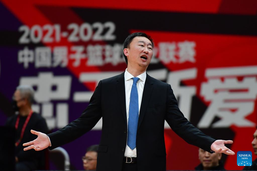 Zhejiang Golden Bulls' head coach Liu Weiwei reacts during the 31st round match between Liaoning Flying Leopards and Zhejiang Golden Bulls at the 2021-2022 season of the Chinese Basketball Association (CBA) league in Shenyang of northeast China's Liaoning Province, March 5, 2022. (Xinhua/Yang Qing)