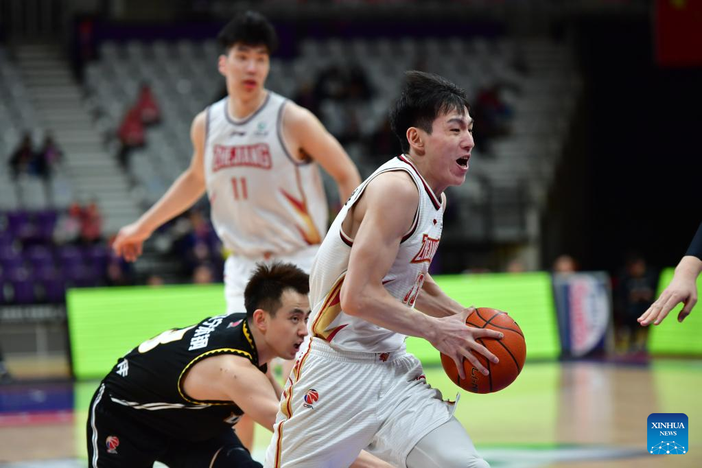 Wu Qian (R) of Zhejiang Golden Bulls breaks through during the 31st round match between Liaoning Flying Leopards and Zhejiang Golden Bulls at the 2021-2022 season of the Chinese Basketball Association (CBA) league in Shenyang of northeast China's Liaoning Province, March 5, 2022. (Xinhua/Yang Qing)