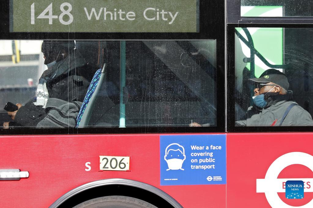 People wearing masks take a bus in London, Britain, March 7, 2022. The global COVID-19 death toll has exceeded 6 million, according to the latest data from the Center for Systems Science and Engineering at Johns Hopkins University on Monday. (Xinhua/Li Ying)