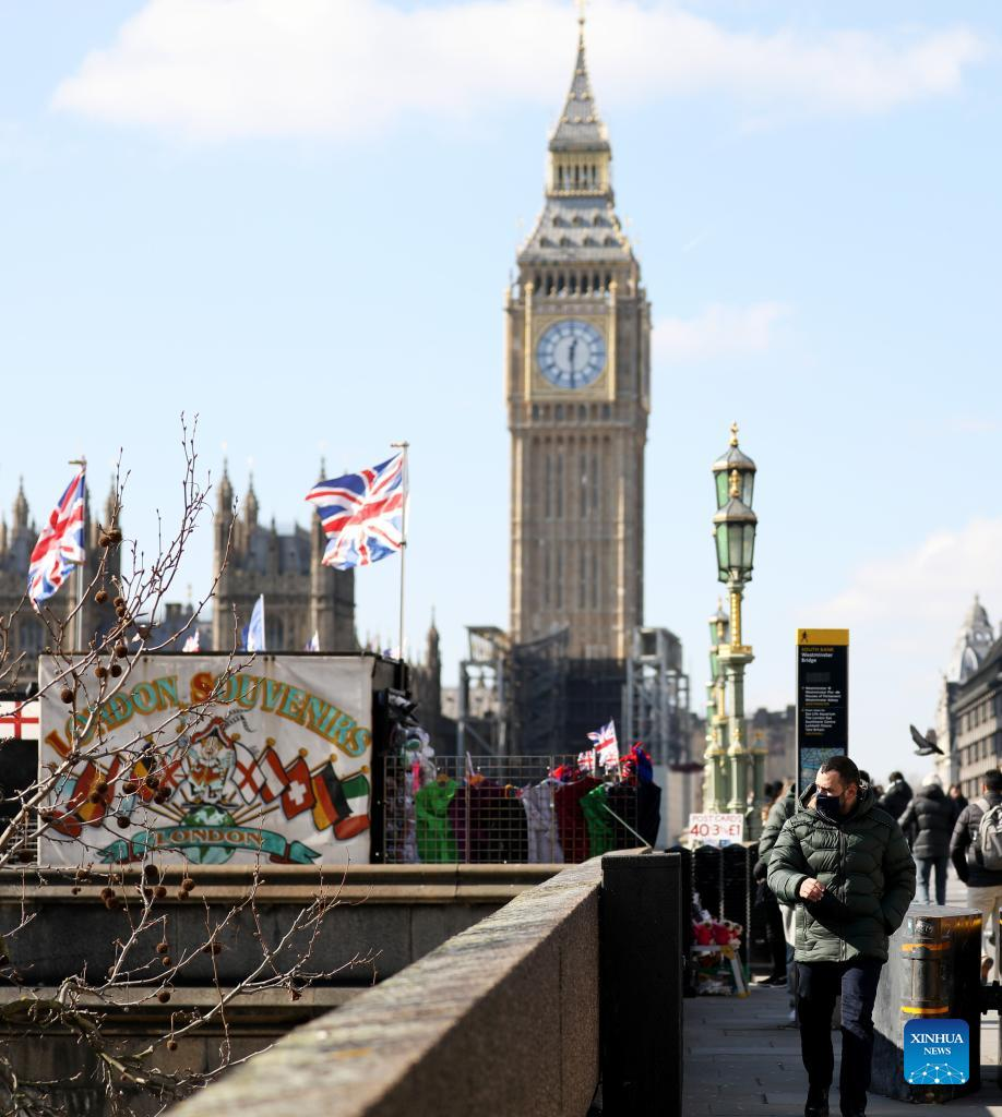 A man wearing a mask walks past Westminster Bridge in London, Britain, March 7, 2022. The global COVID-19 death toll has exceeded 6 million, according to the latest data from the Center for Systems Science and Engineering at Johns Hopkins University on Monday. (Xinhua/Li Ying)