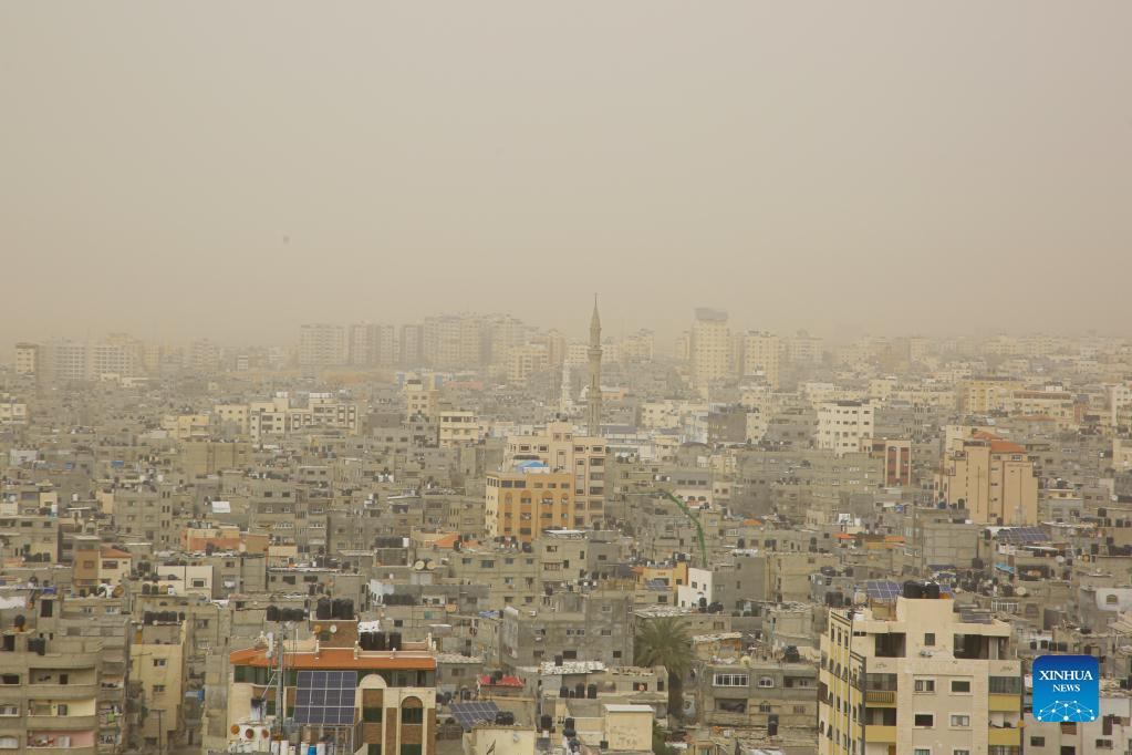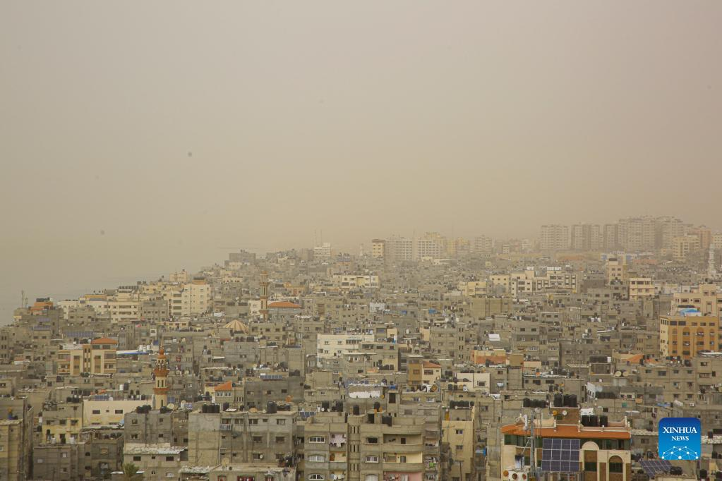 Photo taken on March 6, 2022 shows a view of Gaza City in a dust storm. (Photo by Rizek Abdeljawad/Xinhua)