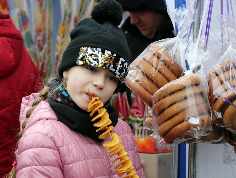 A girl tastes a snack at the Kaziukas fair in Vilnius, Lithuania, on March 5, 2022. (Xinhua/Xue Dongmei)