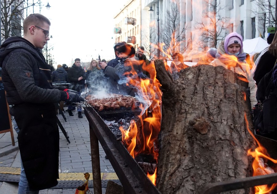 A vendor roasts meat at the Kaziukas fair in Vilnius, Lithuania, on March 5, 2022. The 400-year-old fair kicked off in the Old Town of the Lithuanian capital Vilnius on Friday, attracting more than 800 folk craftsmen, traders and tens of thousands of people. (Xinhua/Xue Dongmei)