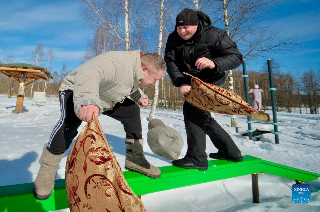 People fight with pillows during Maslenitsa celebrations in Gamzyuki village, Kaluga region, Russia, on March 6, 2022. Maslenitsa is a traditional holiday to celebrate the beginning of spring. (Photo by Evgeny Andreev/Xinhua)