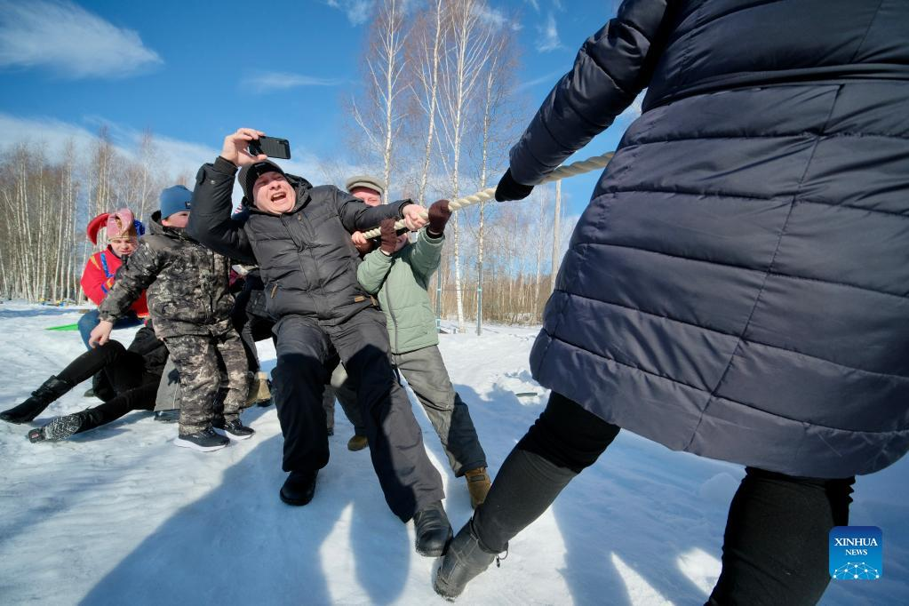 People play tug-of-war during Maslenitsa celebrations in Gamzyuki village, Kaluga region, Russia, on March 6, 2022. Maslenitsa is a traditional holiday to celebrate the beginning of spring. (Photo by Evgeny Andreev/Xinhua)
