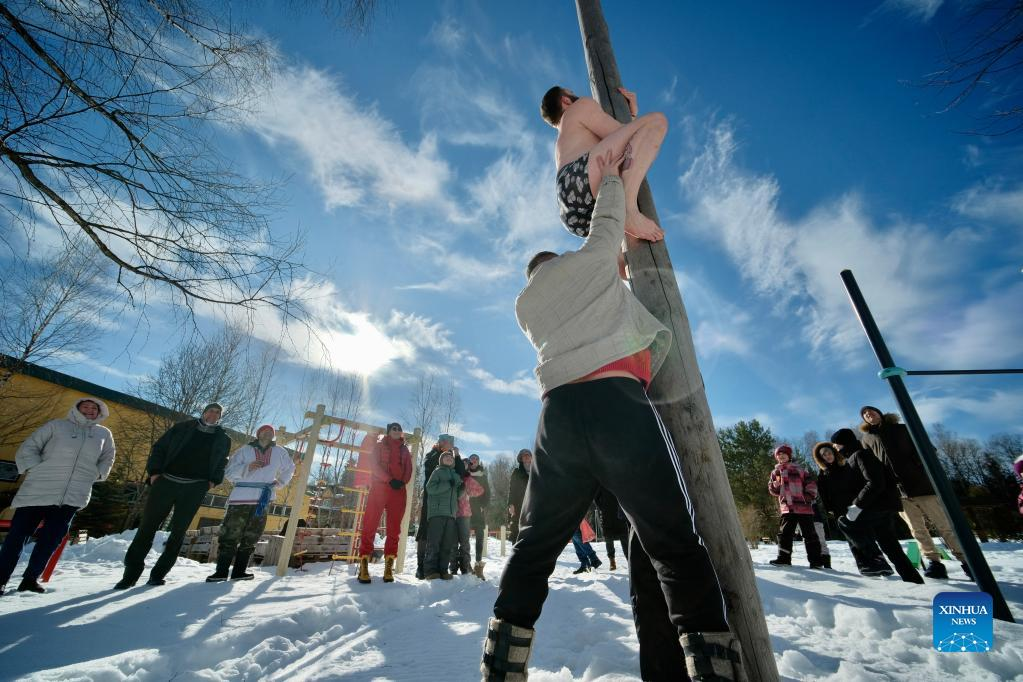 A man climbs a pole during Maslenitsa celebrations in Gamzyuki village, Kaluga region, Russia, on March 6, 2022. Maslenitsa is a traditional holiday to celebrate the beginning of spring. (Photo by Evgeny Andreev/Xinhua)