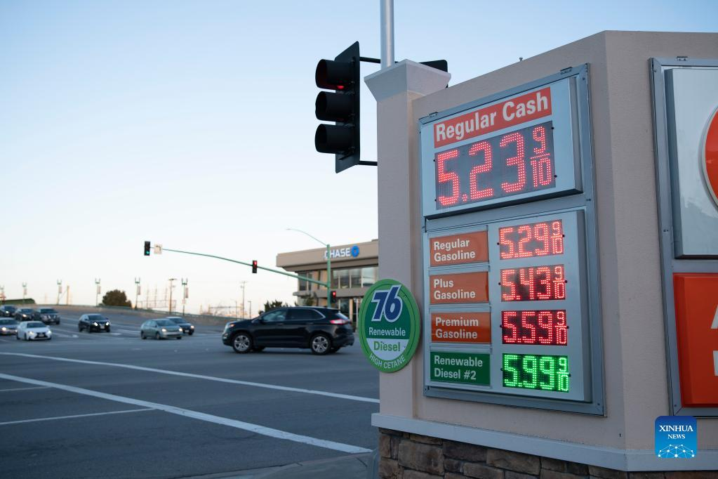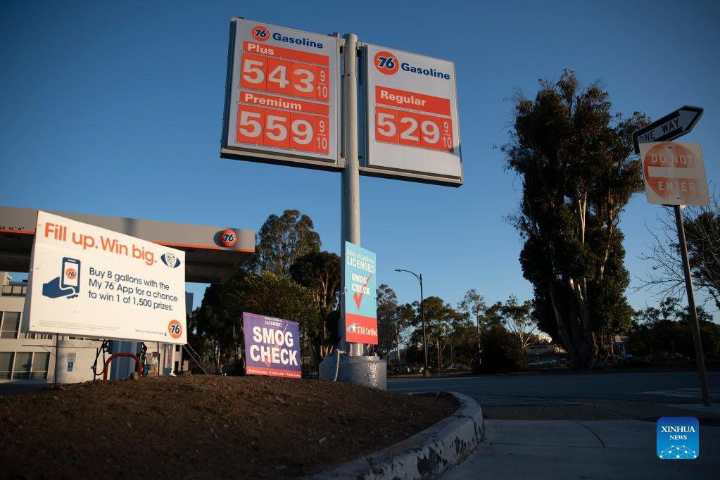 Photo taken on March 6, 2022 shows a gas station in Millbrae, California, the United States. The U.S. national average for a gallon of regular gasoline hit 4.009 U.S. dollars on Sunday, the highest since July 2008, according to the American Automobile Association (AAA). (Photo by Li Jianguo/Xinhua)
