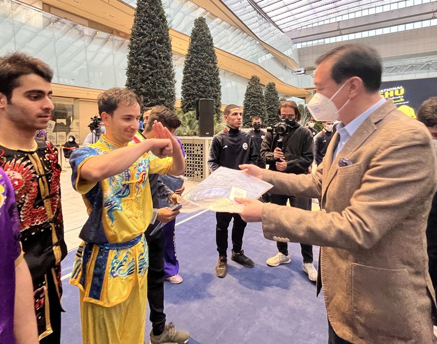 Chinese Ambassador to Iran Chang Hua (R) presents gifts to Kungfu enthusiasts at Iran's first National Wushu Festival in Tehran, Iran, on March 6, 2022. (Chinese Embassy in Iran/Handout via Xinhua)