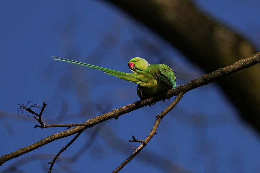 A parrot rests on a branch at the Park of the Fiftieth Anniversary in Brussels, Belgium, March 7, 2022. (Xinhua/Zheng Huansong)